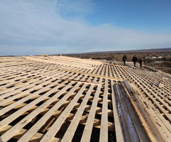 На данный момент уже смонтированы балки перекрытия и обрешетка, а также выполнено присоединение к существующей кровле.