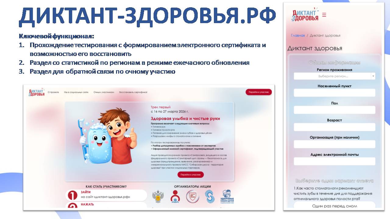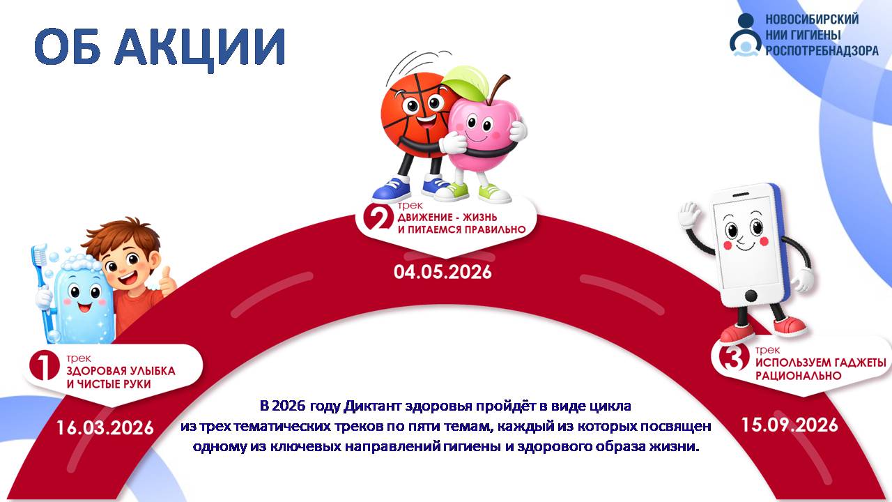 В 2026 году Диктант здоровья пройдёт в виде цикла из трех тематических треков по пяти темам, каждый из которых посвящен одному из ключевых направлений гигиены и здорового образа жизни.