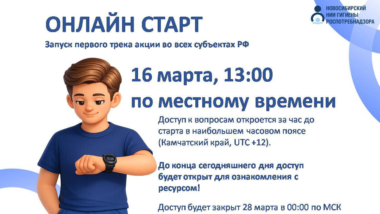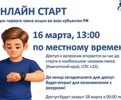 Запуск первого трека акции во всех субъектах РФ 16 марта в 13:00 по местному времени, доступ к вопросам откроется за час до (Камчатский край, UTC +12)