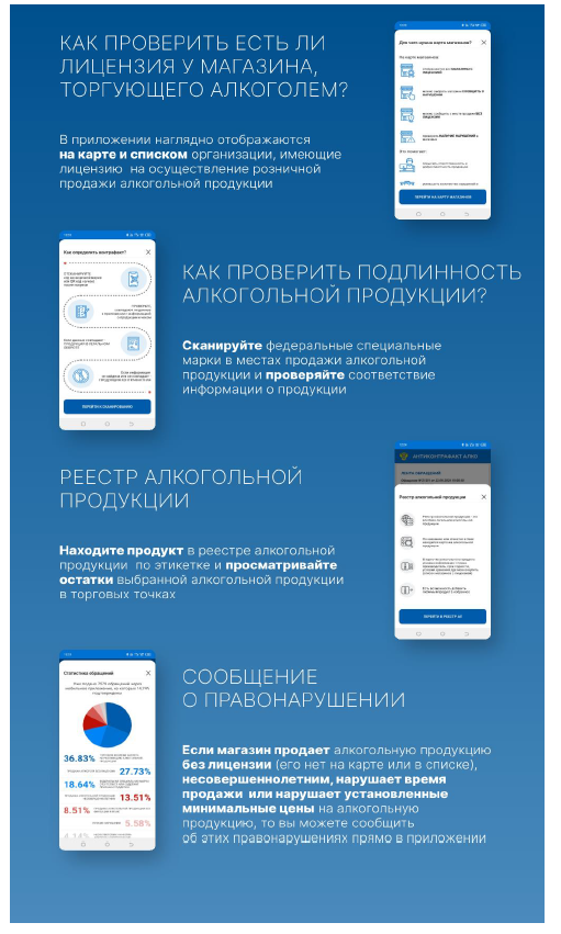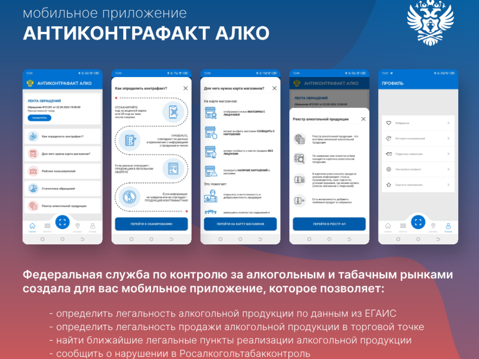 Федеральная служба по контролю за алкогольным и табачным рынками создала для вас мобильное приложение, которое позволяет:
