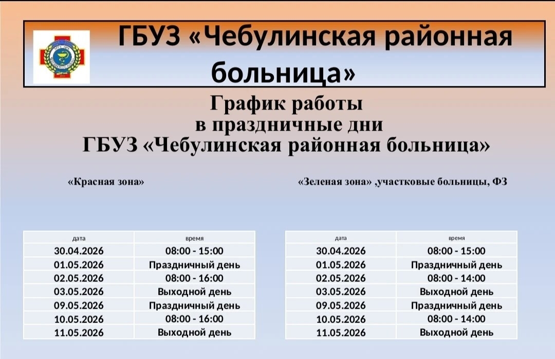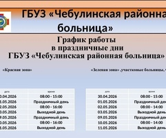 В преддверии майских праздничных дней ГБУЗ КО «Чебулинская районная больница» информирует о графике работы учреждения.