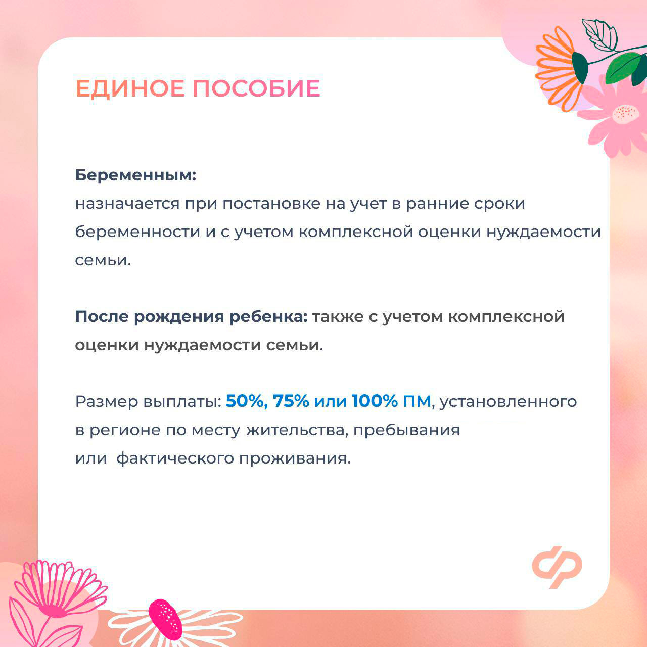 Единое пособие – беременным и семьям с детьми – назначается с учетом комплексной оценки нуждаемости в размере 50%, 75% или 100% ПМ в регионе.