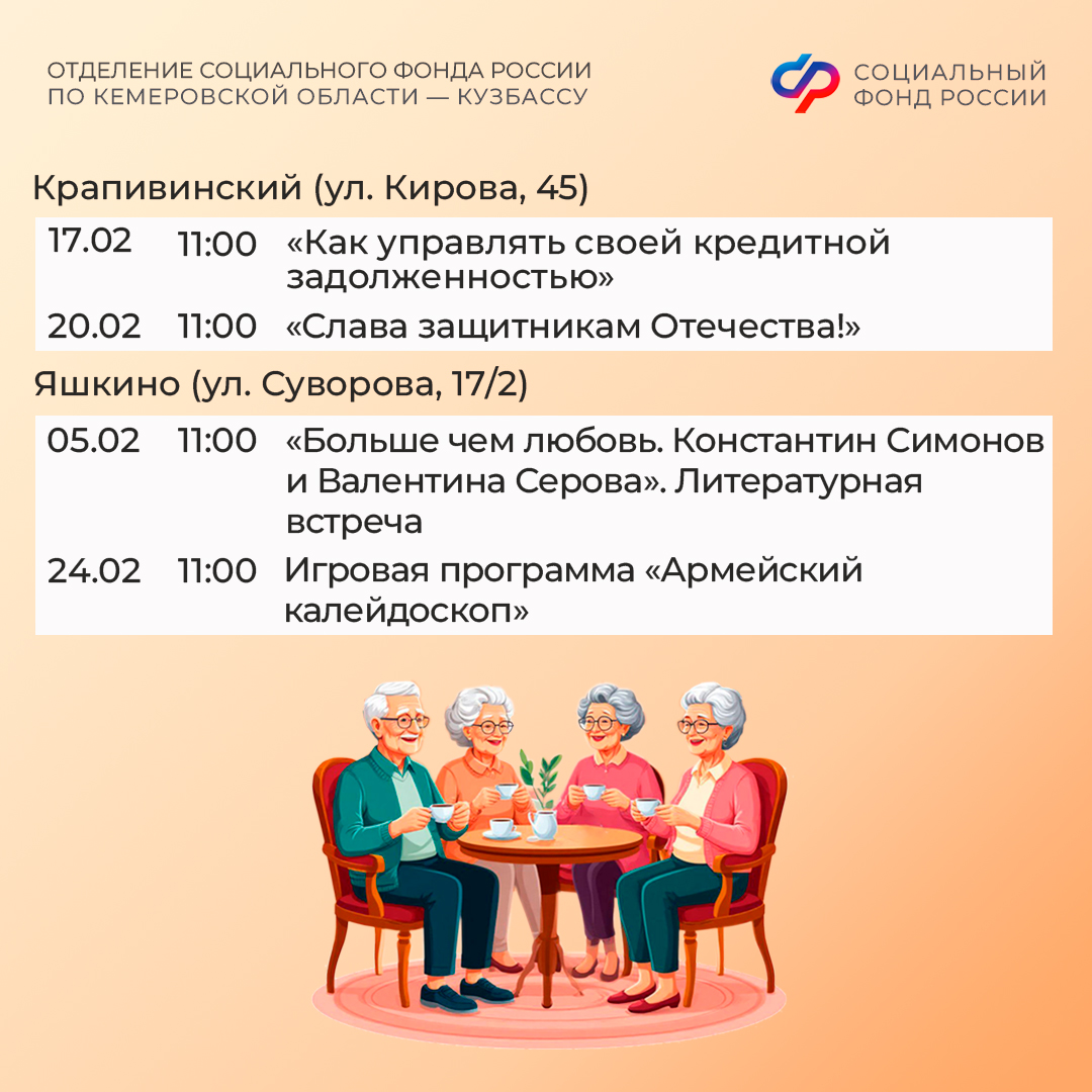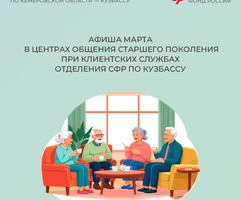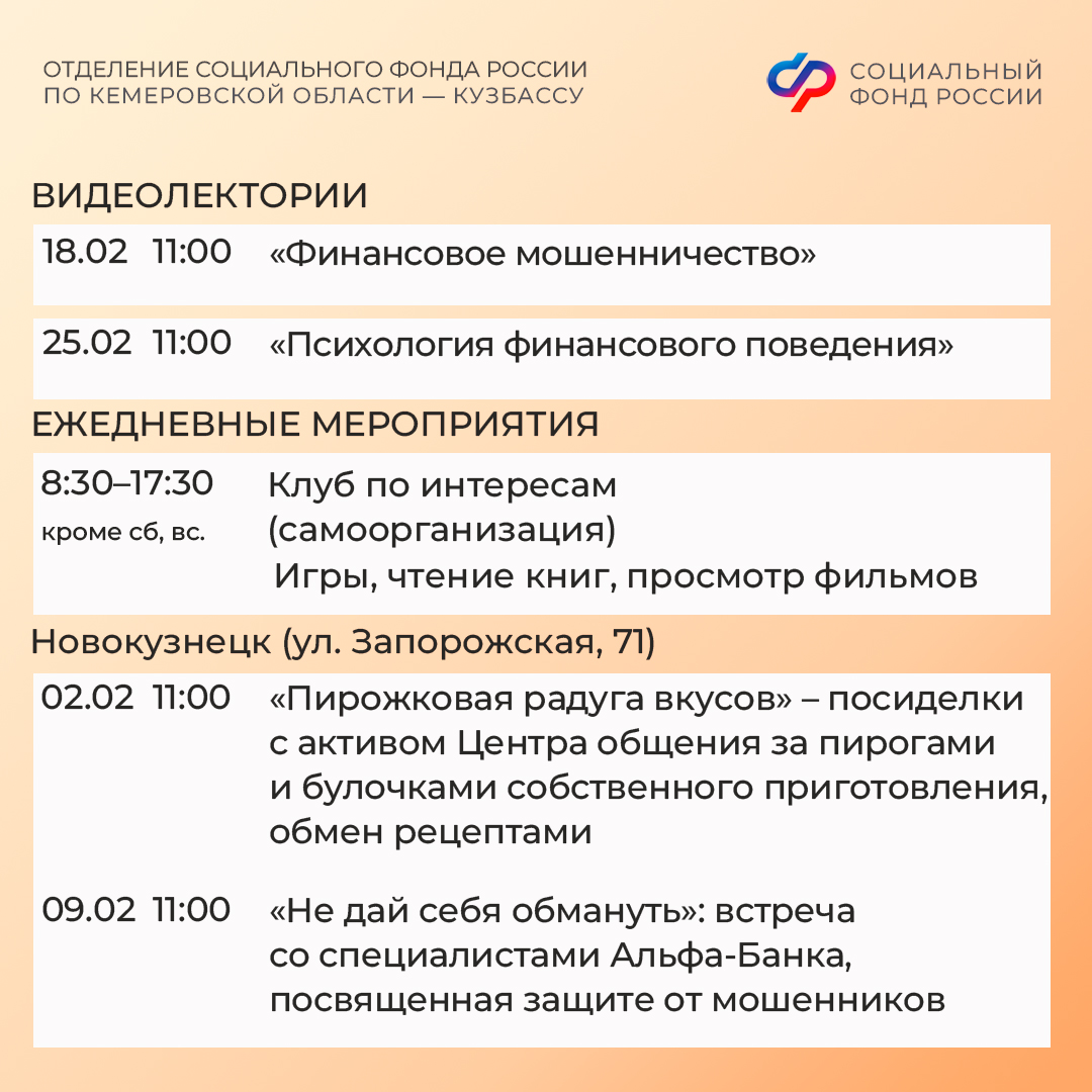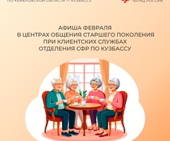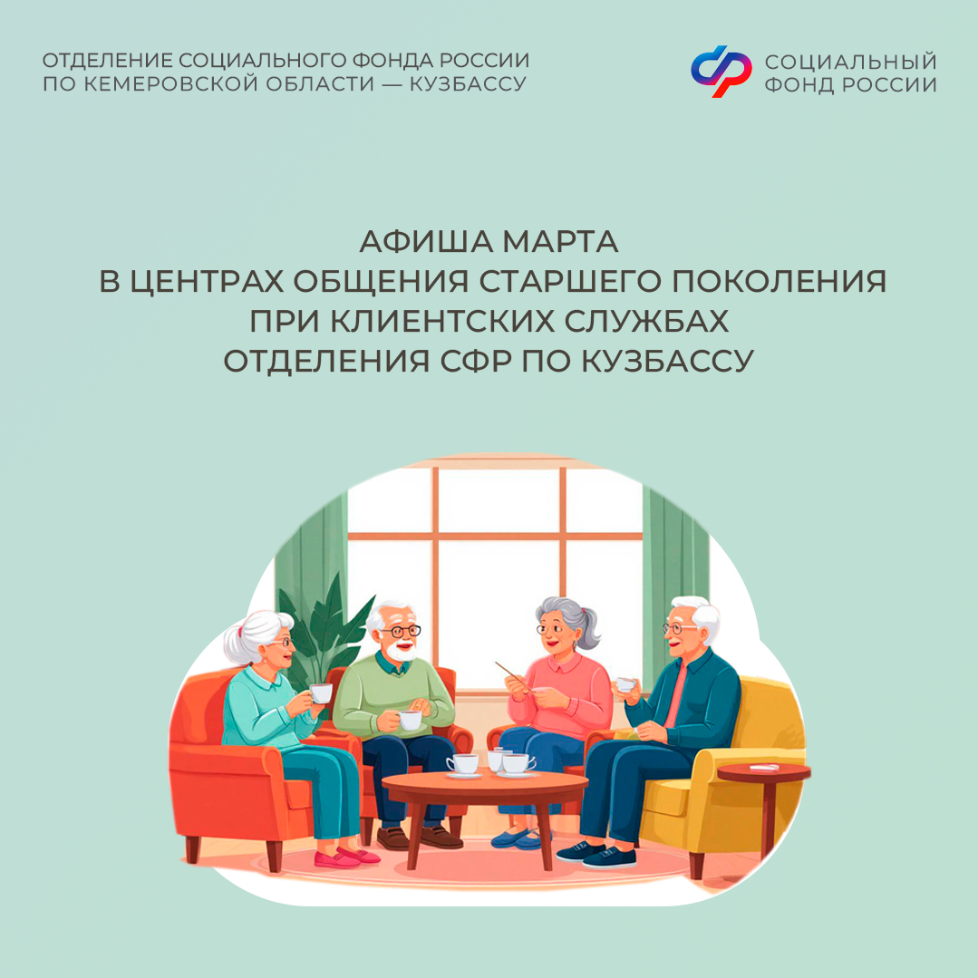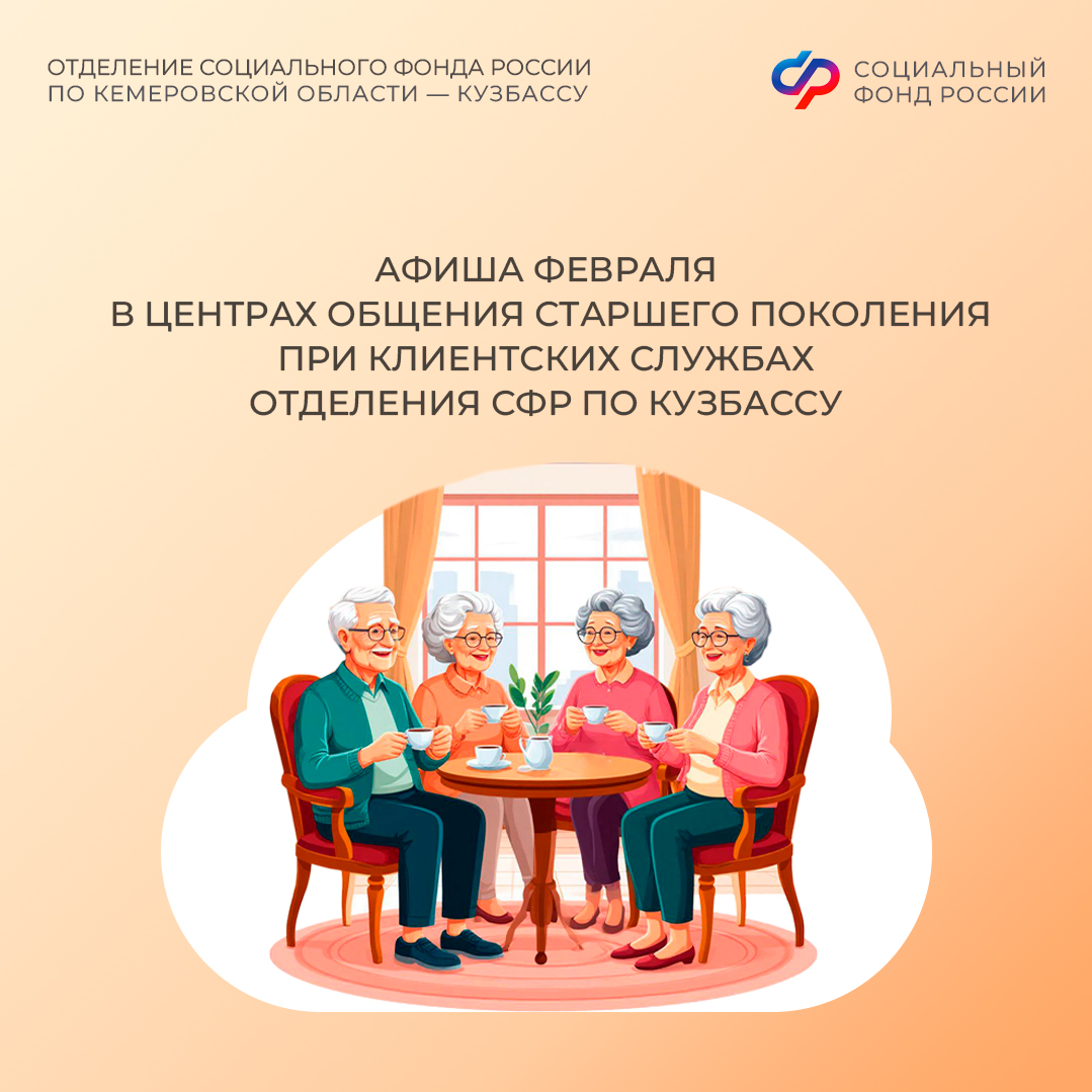 Приглашаем всех желающих принять участие в мероприятиях центров. С адресами, режимом работы и расписанием занятий можно ознакомиться на сайте Отделения СФР по Кузбассу (https://sfr.gov.ru/branches/kuzbass/) в разделе «Информация для жителей региона» / «Центры общения для людей старшего поколения».