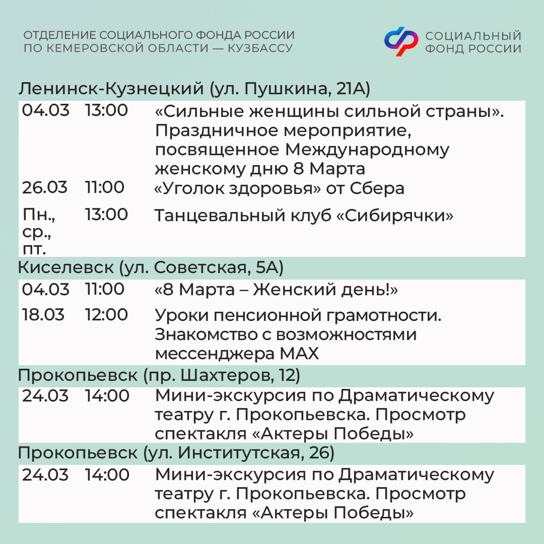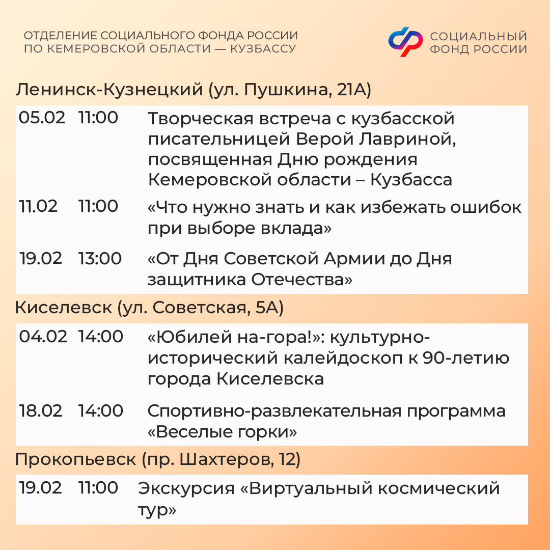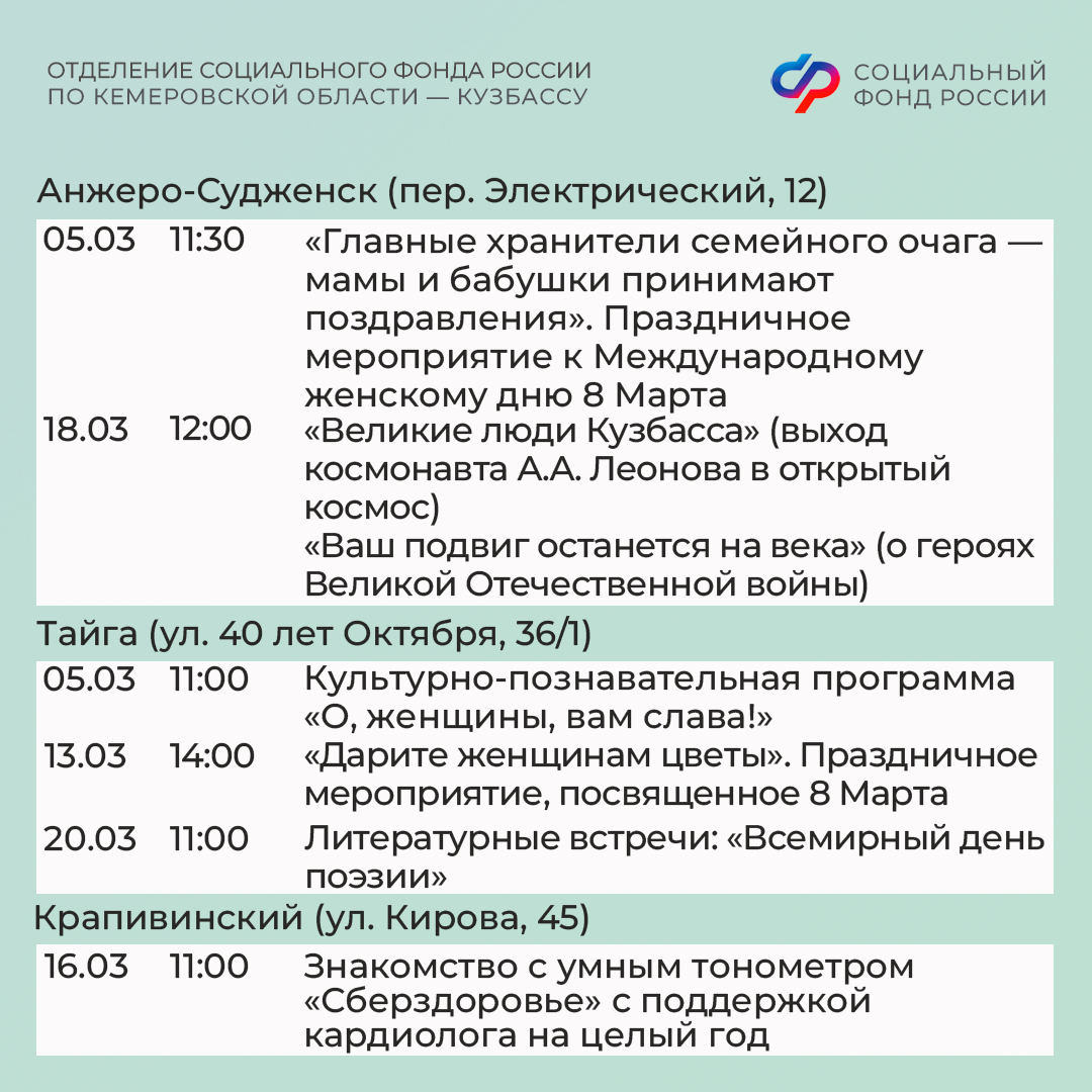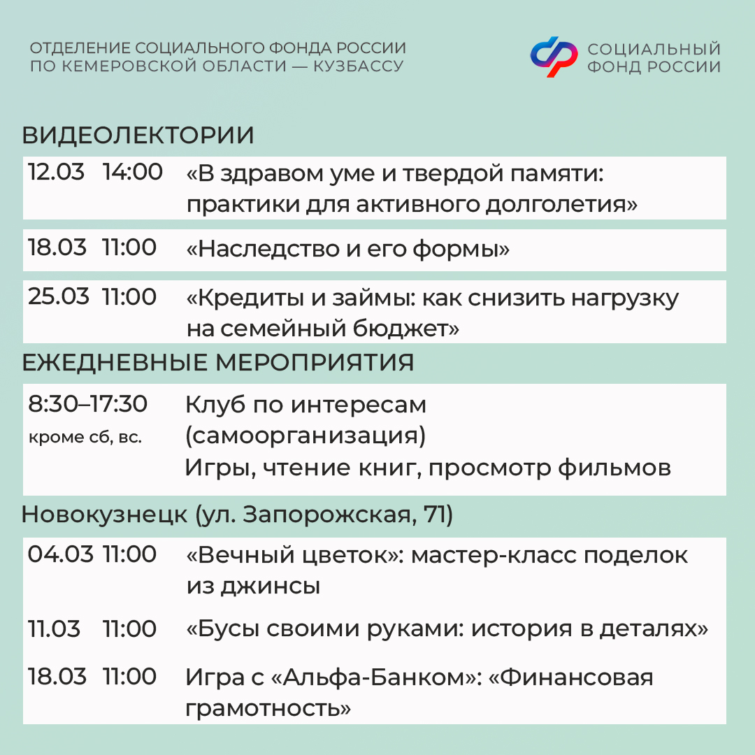 Приглашаем всех желающих принять участие в мероприятиях центров. С адресами, режимом работы и расписанием занятий можно ознакомиться на сайте Отделения СФР по Кузбассу (https://sfr.gov.ru/branches/kuzbass/) в разделе «Информация для жителей региона» / «Центры общения для людей старшего поколения».