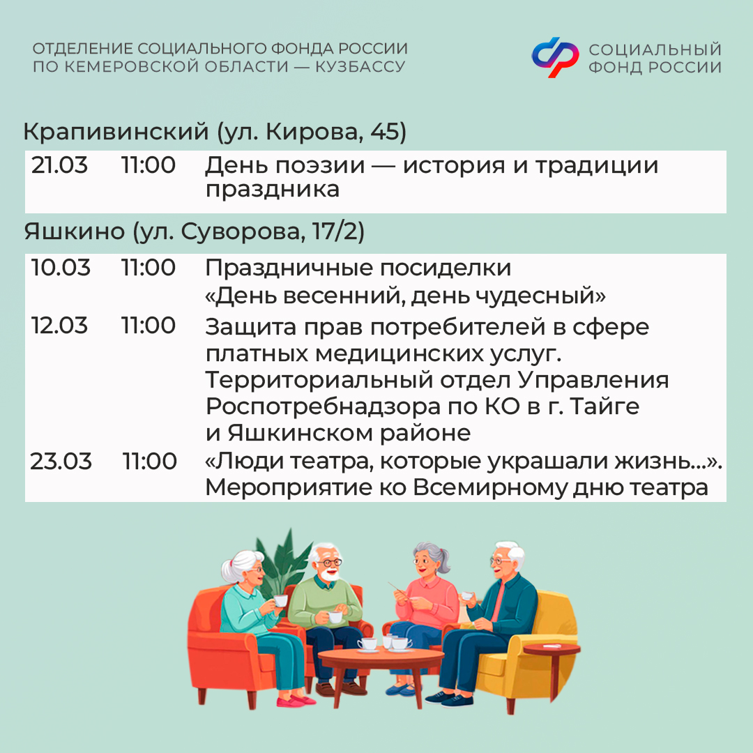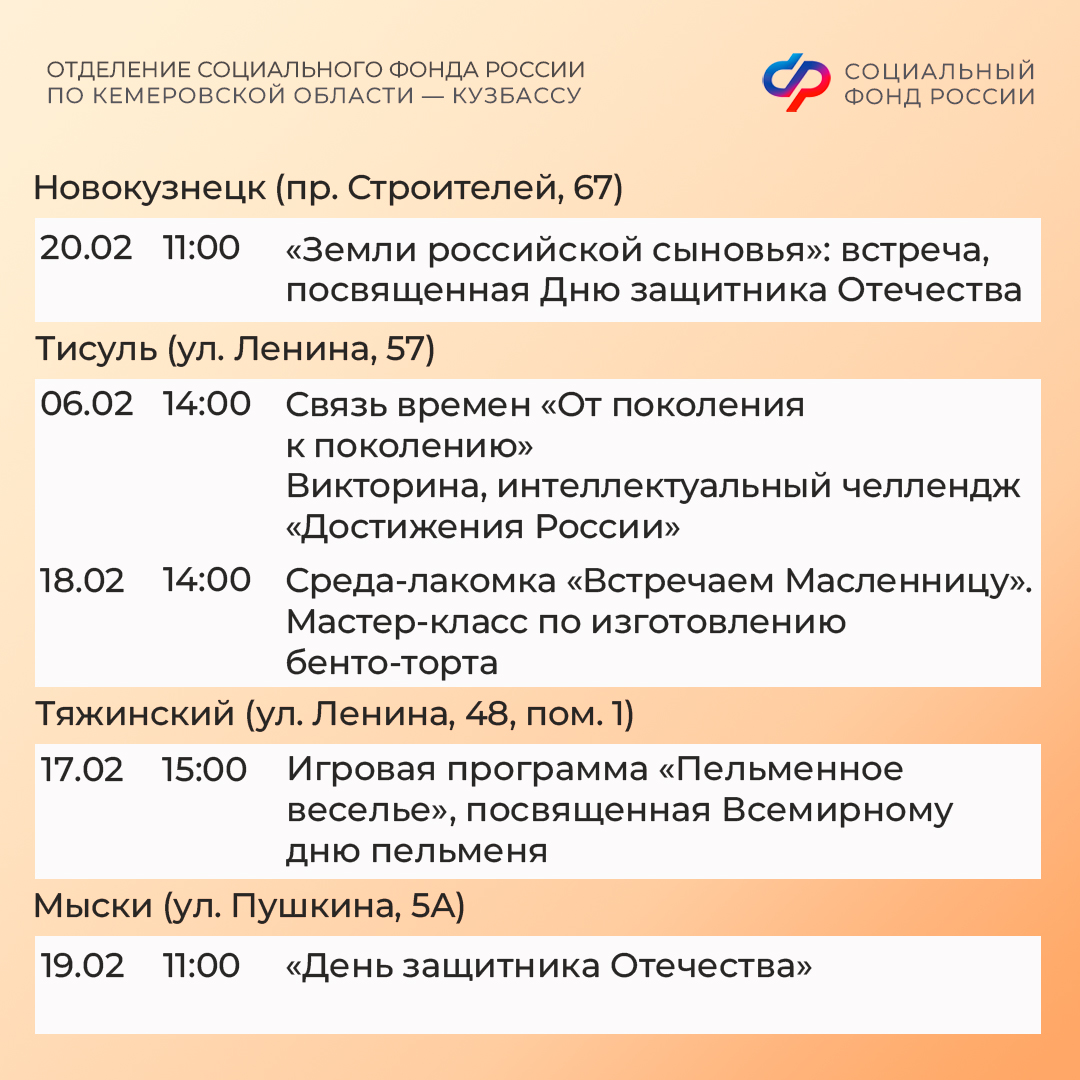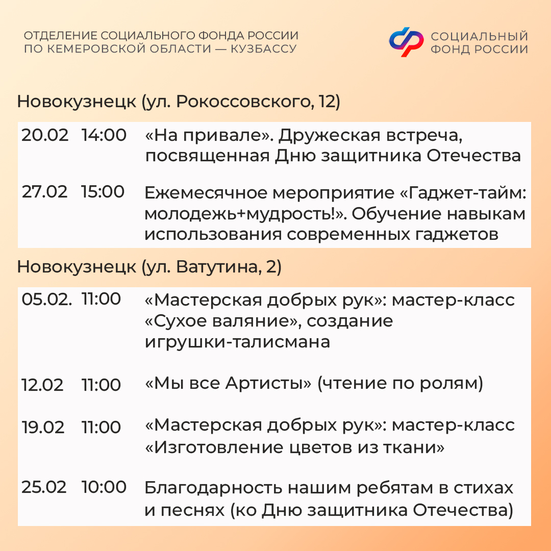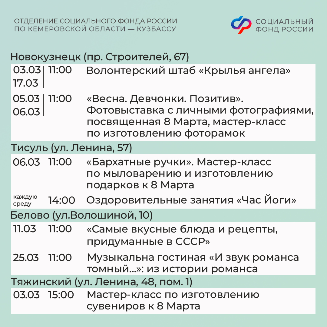 Приглашаем всех желающих принять участие в мероприятиях центров. С адресами, режимом работы и расписанием занятий можно ознакомиться на сайте Отделения СФР по Кузбассу (https://sfr.gov.ru/branches/kuzbass/) в разделе «Информация для жителей региона» / «Центры общения для людей старшего поколения».