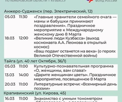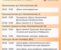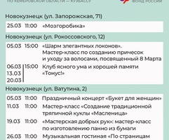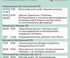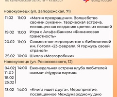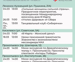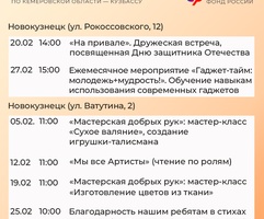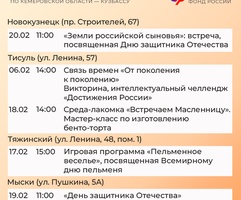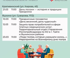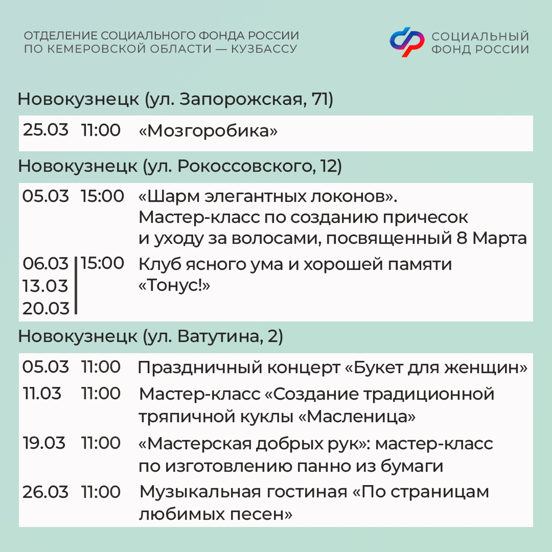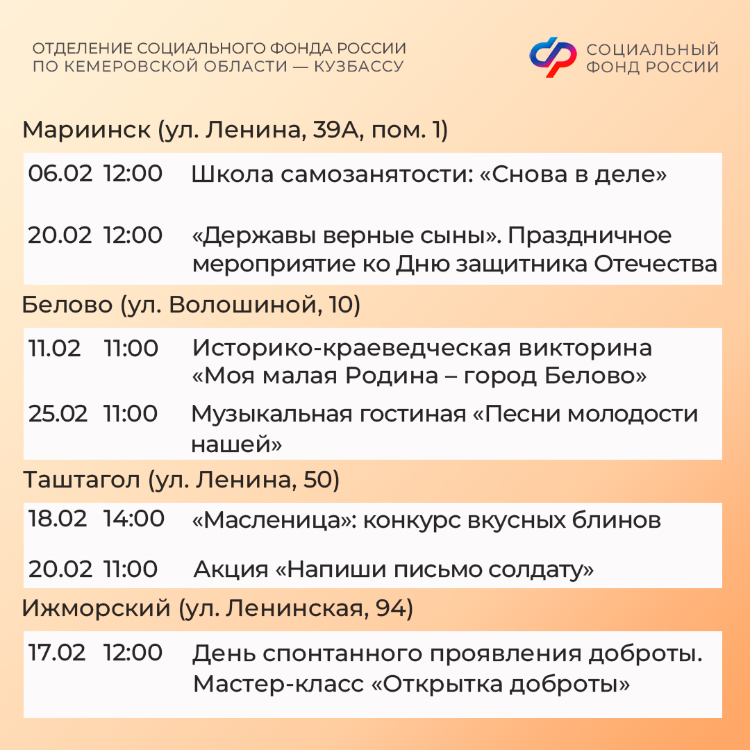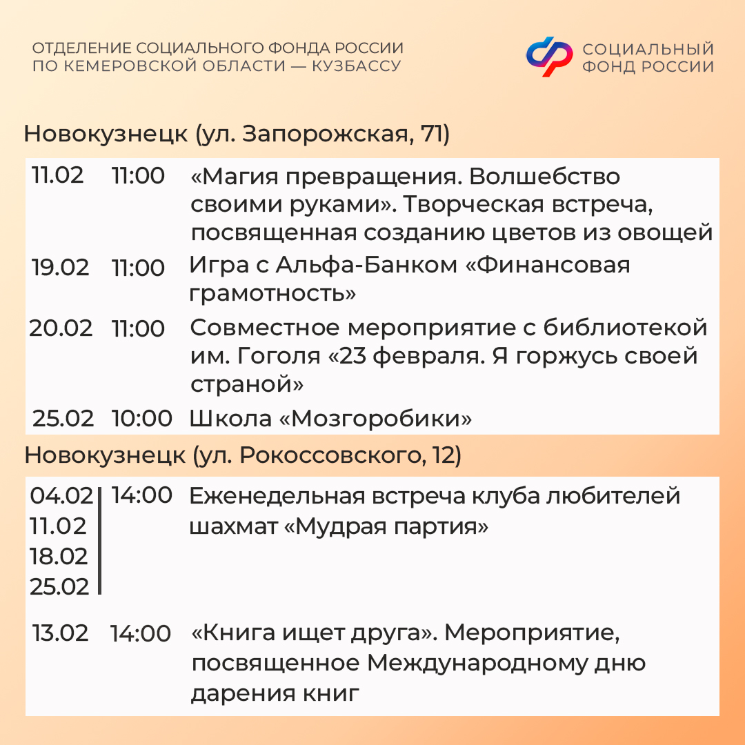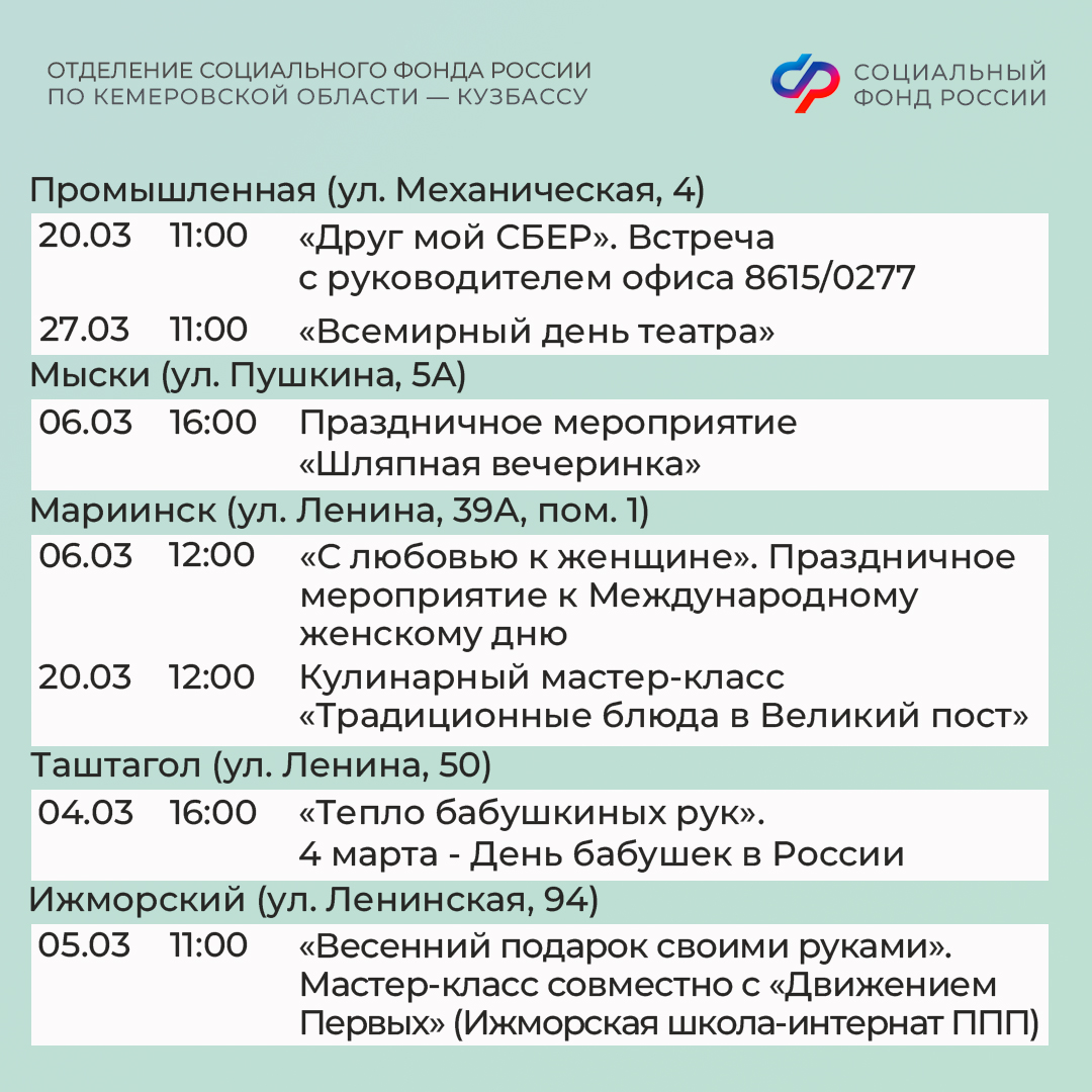 Приглашаем всех желающих принять участие в мероприятиях центров. С адресами, режимом работы и расписанием занятий можно ознакомиться на сайте Отделения СФР по Кузбассу (https://sfr.gov.ru/branches/kuzbass/) в разделе «Информация для жителей региона» / «Центры общения для людей старшего поколения».