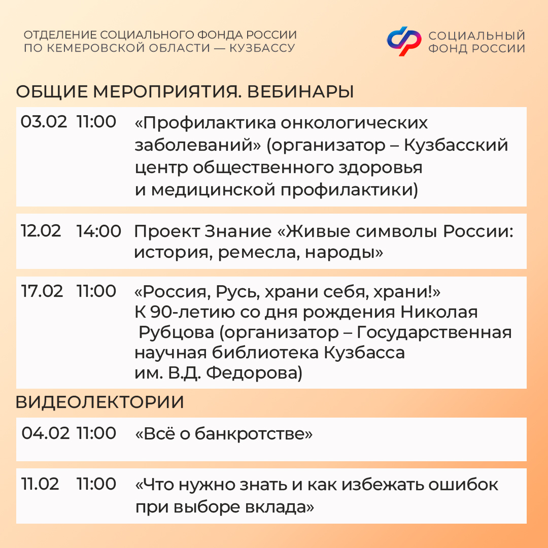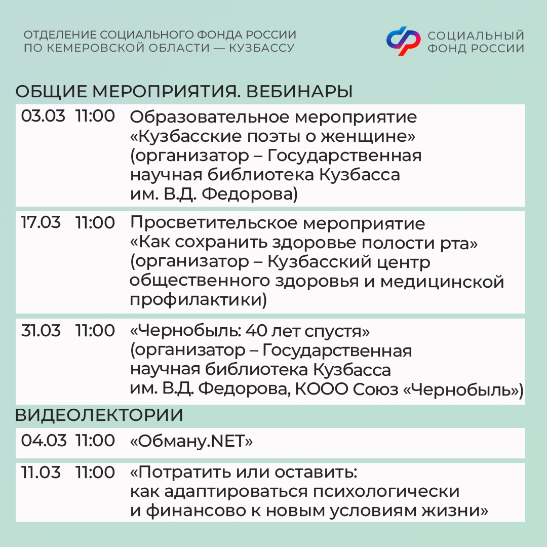 В центрах общения, работающих на базе клиентских служб Отделения СФР по Кемеровской области, проводятся мероприятия в различных форматах. Проходят вебинары о здоровом образе жизни, которые проводят специалисты Кузбасского центра медицинской профилактики. Темами лекций становятся правильное питание, физическая активность, профилактика заболеваний. На таких вебинарах любой гость центров общения может задать медикам свой вопрос и получить квалифицированный ответ.