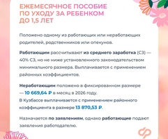 Ежемесячное пособие по уходу за ребенком до 1,5 лет – для работающих составляет 40% среднего заработка, но не ниже минимального размера по законодательству. Неработающим выплачивают в Кузбассе с применением районного коэффициента в размере 13 870,53 руб.