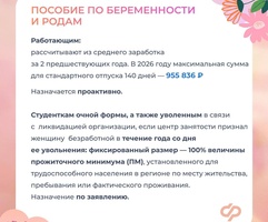 Пособие по беременности и родам – в 2026 г. при стандартном отпуске достигает 955 836 руб.