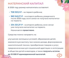Материнский капитал – мера поддержки в рамках нацпроекта «Семья». Составляет 728 921,9 руб. – на первого ребенка и 963 243,17 руб. – на второго, рожденного после 2020 г., если семья не получала маткапитал на первого.